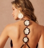 Nas costas, o destaque fica para as flores em crochê com trabalho artesanal, que trazem um detalhe manual e cheio de personalidade à peça.