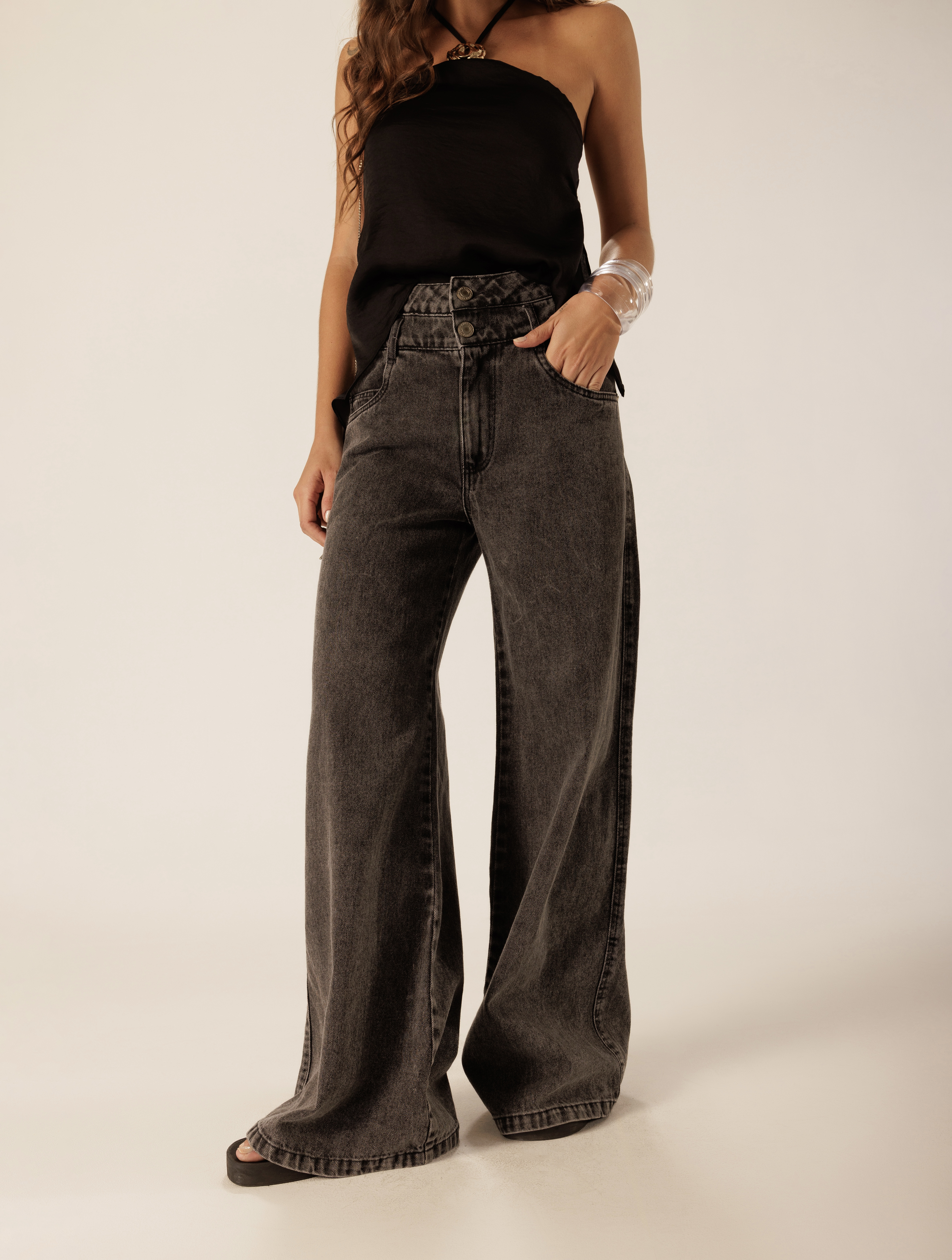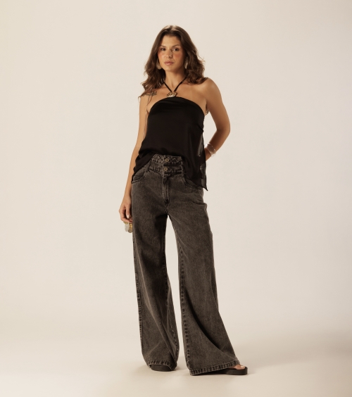 Confeccionada em tecido 100% algodão na cor black, a calça une estrutura e estilo em uma proposta atemporal. O shape amplo traz movimento e elegância, enquanto o denim encorpado garante conforto e versatilidade para composições que vão do casual ao sofisticado.