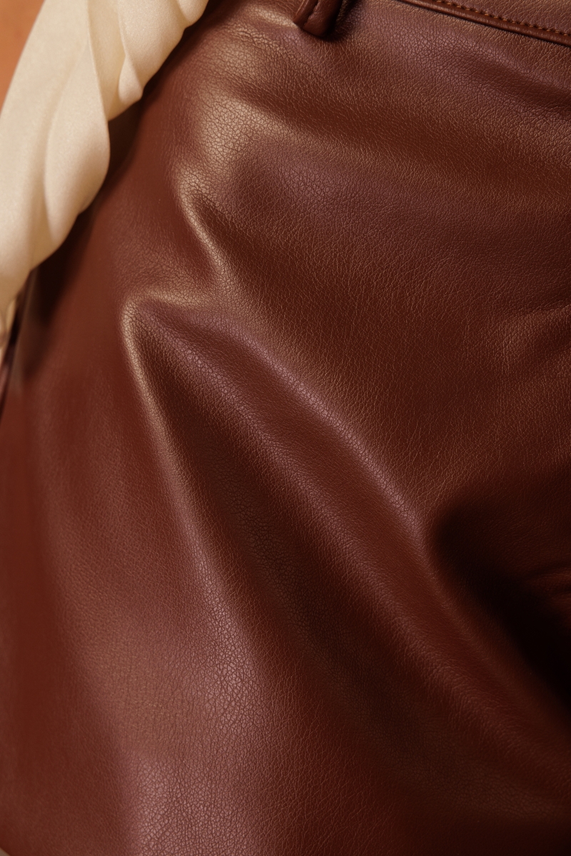 Short Leather Gold com cintura intermediária e modelagem que se ajusta ao corpo, trazendo caimento firme e confortável. Com barra embutida e fechamento com colchete. Confeccionado em 50% viscose e 50% poliéster.