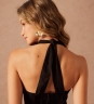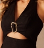 Cropped Black Bella todo duplo com transpasse na frente e recorte que valoriza o corpo, finalizado com aviamento dourado que se destaca no visual. O modelo com amarração no pescoço deixa o colo em evidência e garante ajuste. Confeccionado em 85% viscose, 11% linho e 4% algodão.
