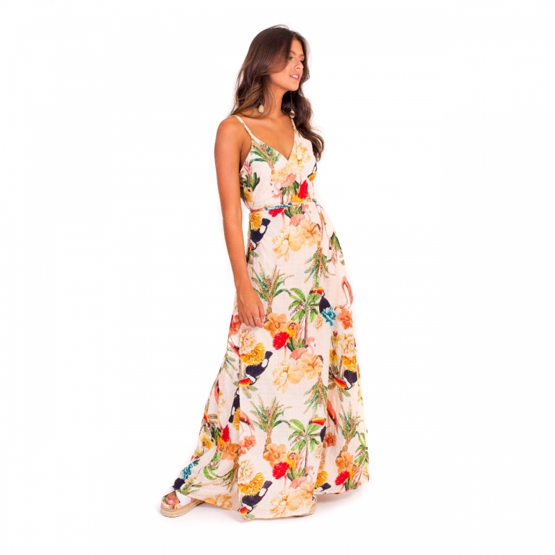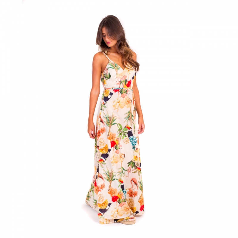 Vestido desenvolvido em tecido leve em composição de algodão e toque macio, decote transpassado e estampa de tucanos tropicais.