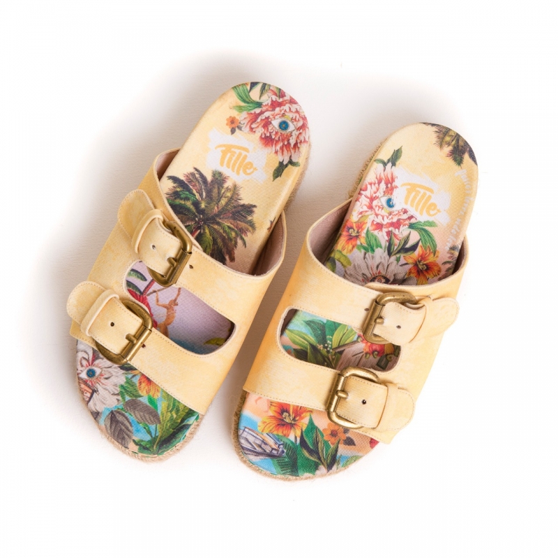 Sandália flat desenvolvida com revestimento em tecido e borracha, estampa tropical e jutas naturais!
